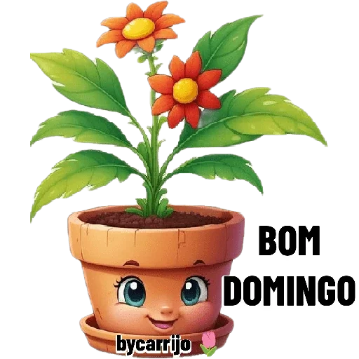 Una planta de dibujos animados con cara feliz en una maceta de terracota, con dos flores naranjas y hojas verdes. Debajo de la maceta dice 'bycarrjo' y al lado 'BOM DOMINGO'.