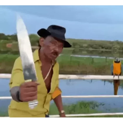 Homem com chapéu preto e camisa azul aponta o dedo indicador para o lado, com um olhar sério e acessórios dourados.
