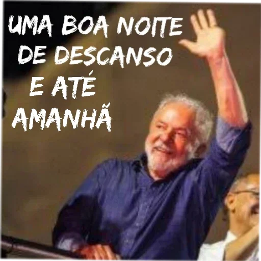 Un hombre mayor con cabello gris y una sonrisa hace un gesto de despedida con la mano derecha, con la frase 'UMA BOA NOITE DE DESCANSO E ATÉ AMANHÃ' escrita en letras blancas a la izquierda.