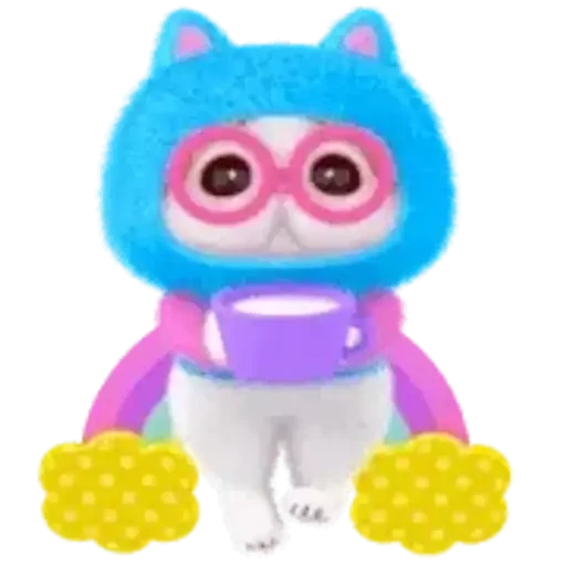Un gato azul con gafas rosadas y orejas de gato, sosteniendo una taza morada y con patas amarillas.