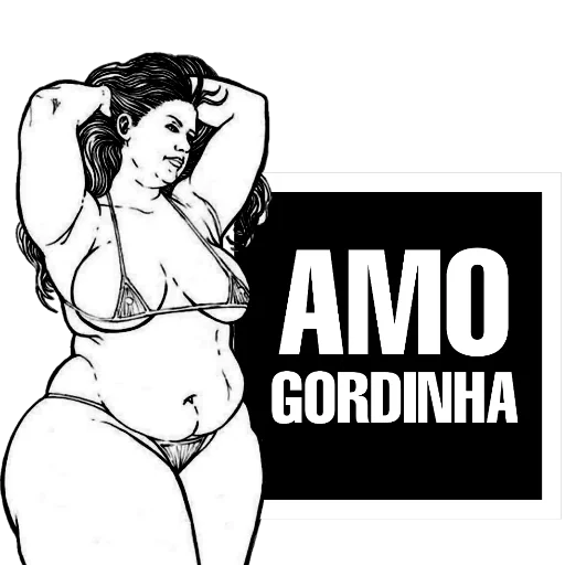 Una mujer en bikini posa sensual, con las manos en el cabello. Al lado, un cuadro negro con texto 'AMO GORDINHA' en letras blancas.