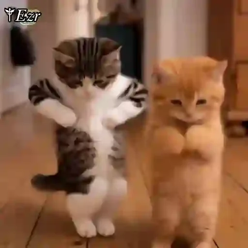 Gato cinza com listras pretas dançando em uma sala com sofá e mesa de madeira ao fundo. O gato tem a pata levantada.