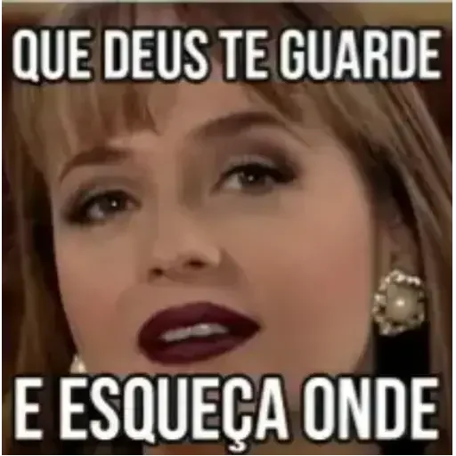Rostro de una mujer con expresión de sorpresa y boca abierta, con el texto "QUE DEUS TE GUARDE E ESQUEÇA ONDE" superpuesto.