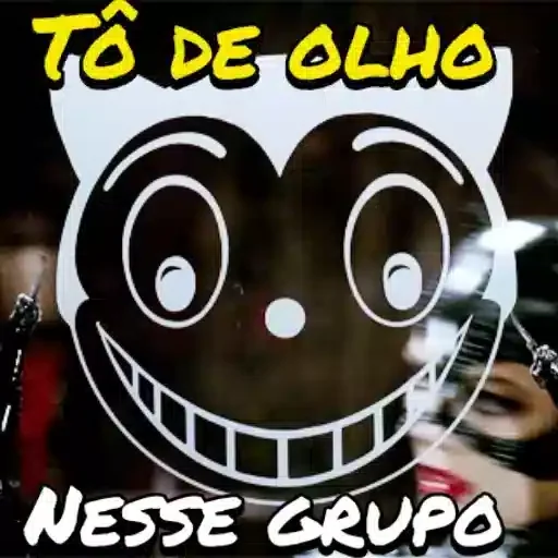 Un rostro de dibujo animado con ojos grandes y sonrisa amplia, con texto 'Tô de olho nesse grupo' en amarillo y blanco.