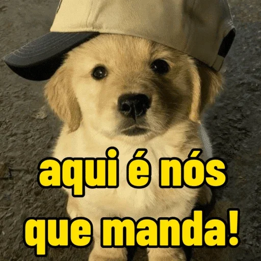Un cachorro cachorro dorado con un gorra beige y negro, con la frase 'aqui é nós que manda!' en letras amarillas.