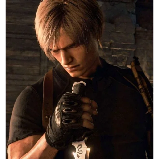 Personagem de jogo com cabelo loiro curto e camisa preta, com expressão séria e mãos enluvadas.