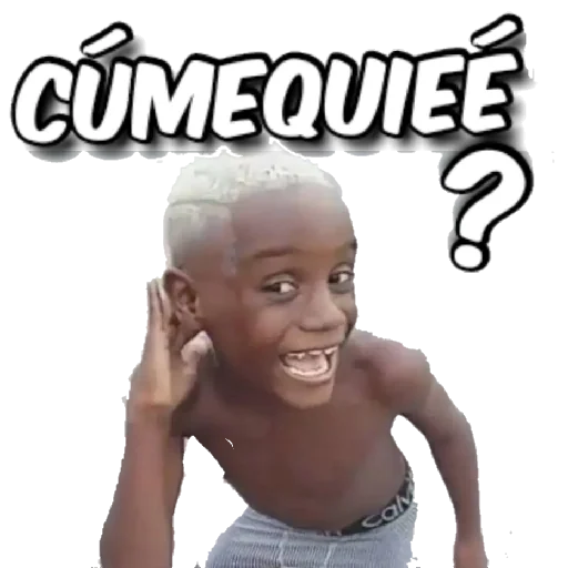 Un hombre con la piel oscura y cabello blanco corto, con una expresión de sorpresa y confusión, haciendo un gesto con la mano cerca del oído. Está con el torso desnudo y pantalones de jeans. La imagen incluye el texto 'CÚMEQUIEÉ?'