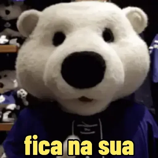 Un oso polar con una expresión neutral que viste una camisa azul, con el texto 'fica na sua' en amarillo en la parte inferior.