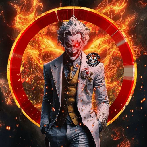 Un hombre con aspecto de payaso, que viste un traje gris y naranja, con un fondo de llamas y un círculo rojo. Tiene una mirada siniestra y piel pálida.