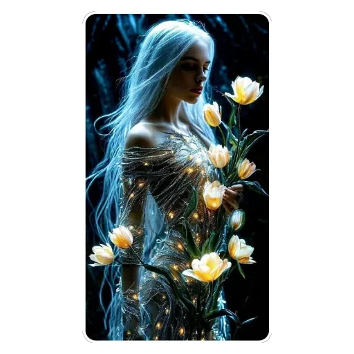 Uma mulher com cabelos longos e azuis, vestida com um traje preto e verde, rodeada de flores azuis e verdes com…