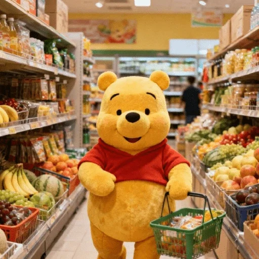 Un oso Winnie-the-Pooh sonriente, con una camisa roja, está en un pasillo de supermercado con una cesta de compras verde en la mano.