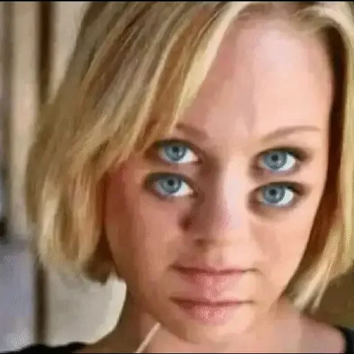 Rostro de una mujer rubia con ojos azules y expresión sorprendida o confundida.