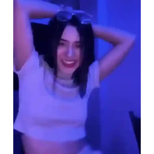 Una joven mujer con cabello negro y blusa blanca, manos en la cabeza, sonriendo, en un ambiente con iluminación azul.