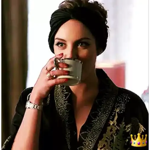 Mujer morena bebiendo de una taza, con un albornoz negro con detalles dorados y un reloj de pulsera. Tiene una expresión seria y su cabello envuelto en una toalla.
