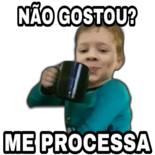 Niño con expresión facial divertida, sosteniendo una taza, con el texto 'NÃO GOSTOU? ME PROCESSA' en letras grandes.