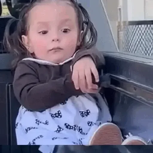 Niña sentada en el asiento trasero de un coche con expresión seria, llevando un abrigo marrón y ropa blanca con estampados.