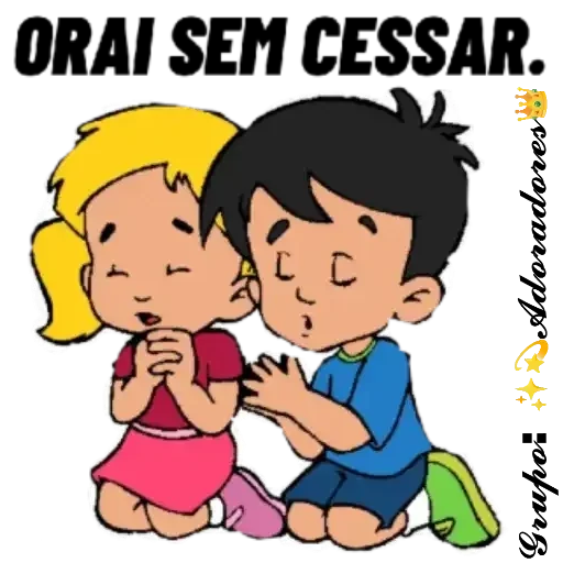 Un niño y una niña arrodillados con las manos juntas en oración. La niña tiene cabello rubio y viste una falda rosa, mientras que el niño tiene cabello negro y viste una camisa azul. El texto 'ORAI SEM CESSAR' aparece arriba de ellos.