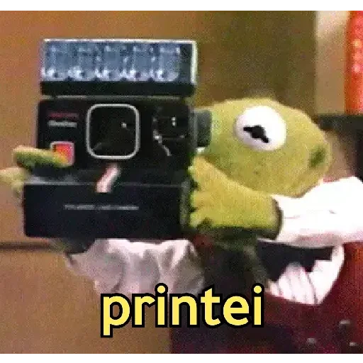Un personaje de Kermit de los Muppets sosteniendo una cámara Polaroid con el texto 'printei' en amarillo en la parte inferior.
