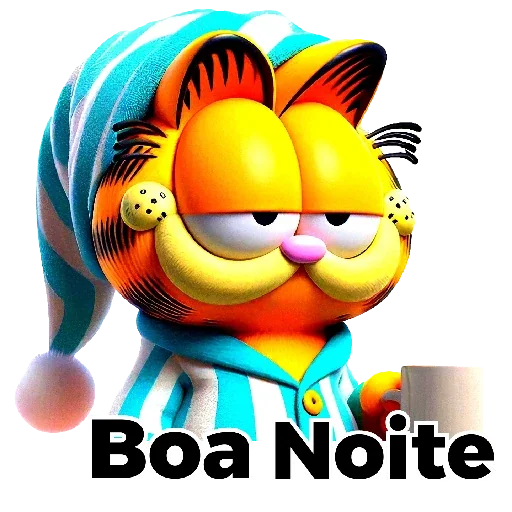 Gato con pijama y expresión soñolienta, sosteniendo una taza, con texto 'Boa Noite' debajo.