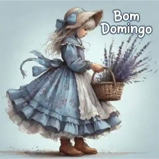 Niña con un vestido azul largo y sombrero, sosteniendo una cesta de lavanda, con el texto 'Bom Domingo' en la parte superior derecha.