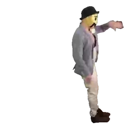 Un hombre con cabello rubio, bigote y sombrero negro señala hacia la derecha con su mano izquierda, vistiendo una chaqueta gris, camisa rosa, pantalones beige y zapatos marrones.