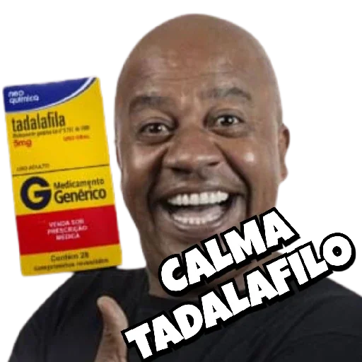 Un hombre negro calvo con una amplia sonrisa y un paquete de medicamentos Tadalafilo al lado, con texto superpuesto que dice 'CALMA TADALAFILO'.