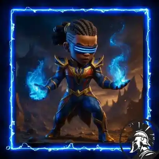 Personaje con armadura azul y dorada, cabello negro recogido, emitiendo llamas azules de las manos. Fondo oscuro con contorno de luz azul.