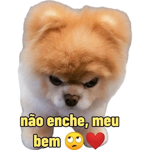 Un perro lindo con una expresión de desaprobación, acompañado del texto 'não enche, meu bem' y emojis de cara fruncida y corazón.