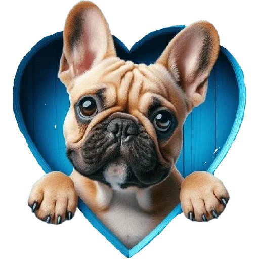 Un bulldog francés con orejas grandes y ojos grandes está dentro de un corazón azul. El perro tiene un hocico negro y uñas pintadas.