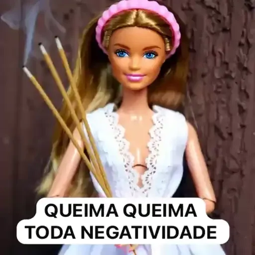 Muñeca Barbie con banda rosa en la cabeza y vestido blanco, sosteniendo palitos de incienso, con texto 'QUEIMA QUEIMA TODA NEGATIVIDADE'