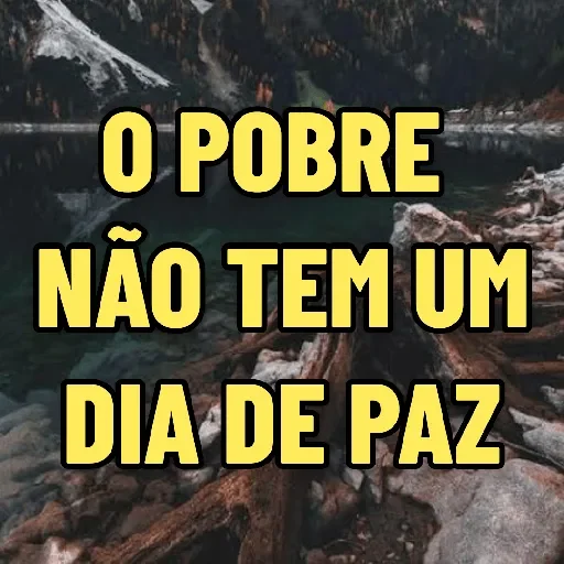 Un paisaje natural con montañas y agua al fondo, con el texto "O POBRE NÃO TEM UM DIA DE PAZ" en letras grandes y amarillas superpuestas.