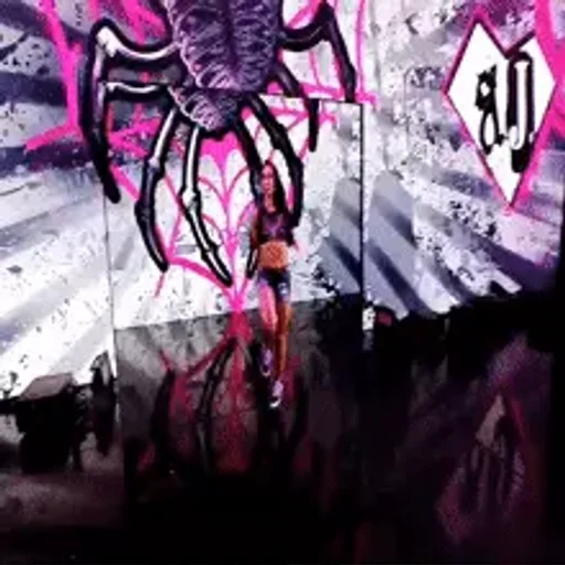 Una araña negra con detalles rosa y negros, sobre un fondo gris y negro. Hay un símbolo negro en un diamante blanco en la esquina superior derecha.