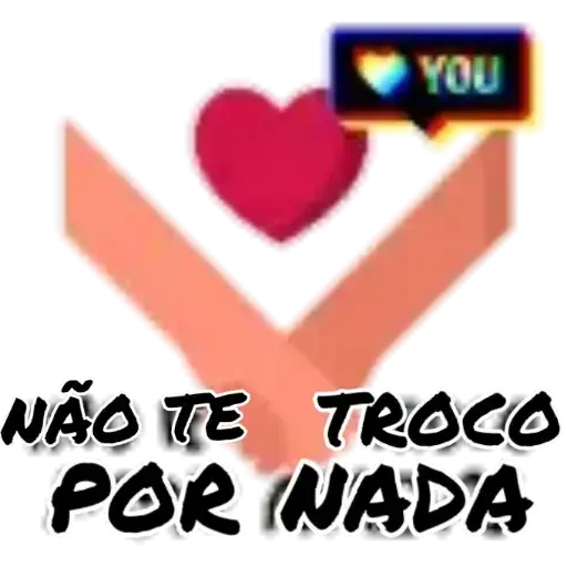 Un corazón rojo con dos brazos que lo abrazan, con un pequeño corazón y la palabra 'YOU' en una caja de texto. Debajo, la frase 'NÃO TE TROCO POR NADA' en letras negras.