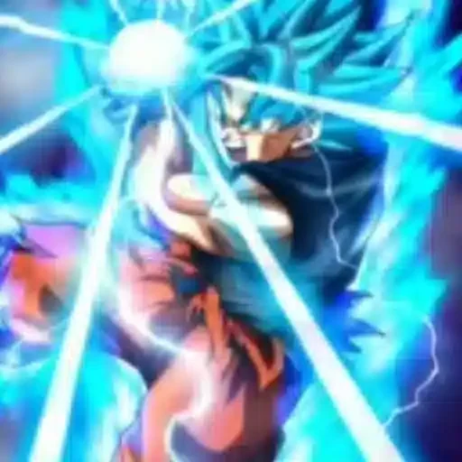 Goku com cabelo preto espetado em uma pose de luta, com chamas azuis saindo de suas mãos.