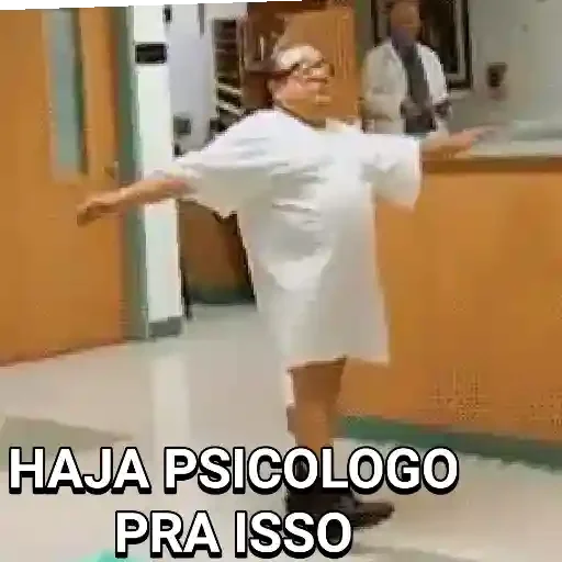 Una mujer con bata médica, brazos extendidos y gafas, en un pasillo de hospital. En la esquina inferior izquierda, aparece el texto 'HAJA PSICOLOGO PRA ISSO' en blanco con contorno negro.