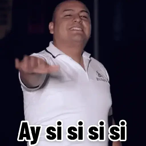 Un hombre de mediana edad con una amplia sonrisa y un gesto de mano extendida, usando una camisa blanca. La leyenda 'Ay si si si si' aparece en la parte inferior.