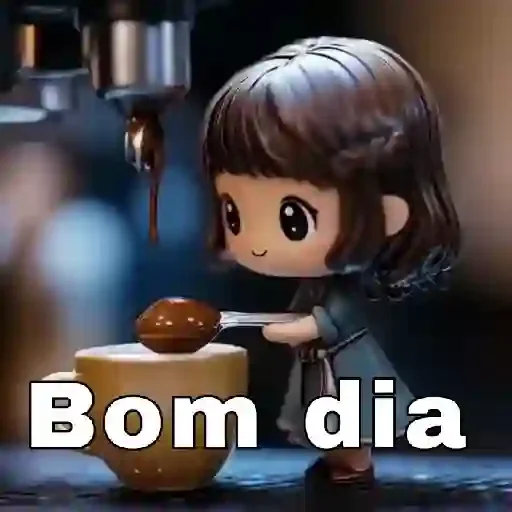 Una niña de pelo castaño y ojos grandes prepara un café con una expresión feliz. La imagen muestra el texto 'Bom dia' destacado.