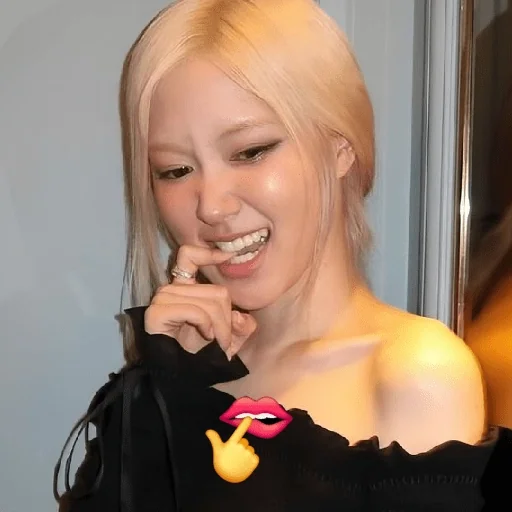 Mujer rubia con expresión de sorpresa o complicidad, con un vestido negro, con emojis de beso y pato en el pecho.