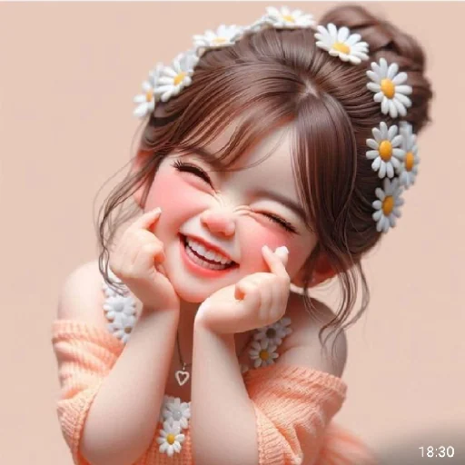 Niña con flores en el cabello y una amplia sonrisa, manos cerca de la cara, mostrando una expresión feliz y animada.