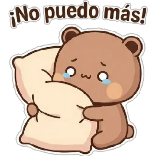 Un osito de peluche marrón con ojos tristes y lágrimas en los ojos, abrazando una almohada. La frase '¡No puedo más!' aparece encima de él.