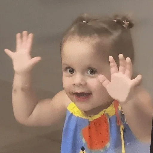 Niña pequeña con las manos levantadas y expresión alegre, vistiendo una blusa azul con cuello amarillo y un lazo rojo.