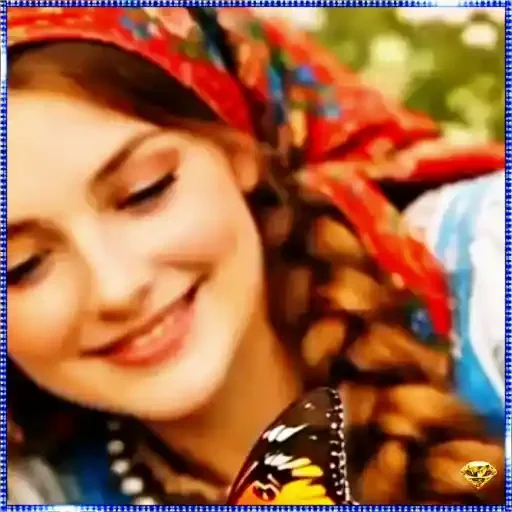 Mulher com os olhos fechados e sorriso, usando um lenço colorido na cabeça e um vestido tradicional, com texto 'В…