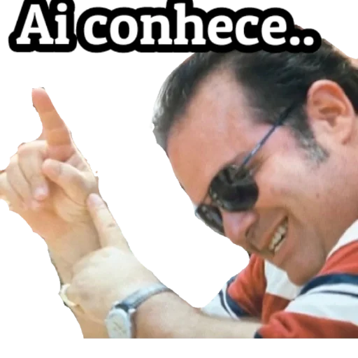 Hombre con gafas de sol y camisa naranja señala hacia arriba con una sonrisa, texto "Ai conhece.."