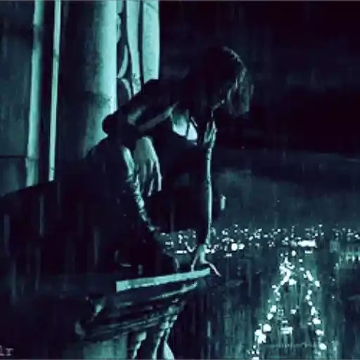 Uma mulher de vestido preto subindo uma escada com grades de metal decorativas. A imagem é em preto e branco com uma…