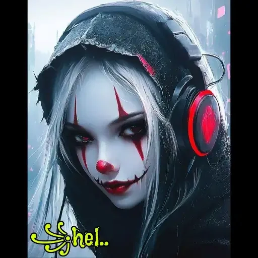 Una mujer con maquillaje de payaso y cabello gris usando auriculares. Tiene una expresión siniestra y el texto 'hel...' en verde en la esquina inferior izquierda.