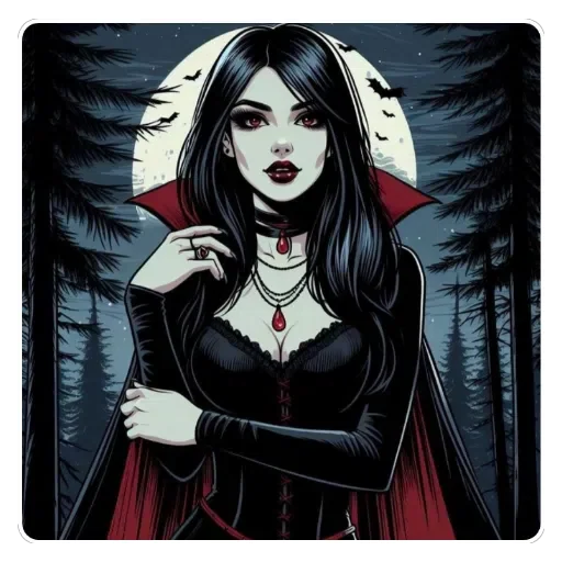 Uma mulher com olhos vermelhos e maquiagem escura, usando um chapéu preto com uma caveira branca, um crucifixo e um…