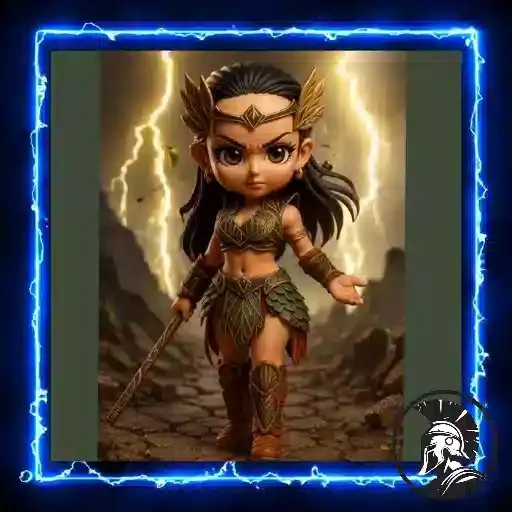 Una guerrera de anime con armadura verde y cabello negro, sosteniendo una espada, con rayos de fondo.