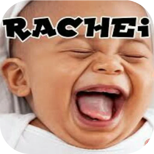 Bebé con la boca abierta y ojos cerrados, pareciendo llorar o gritar. La palabra 'RACHEi' está escrita en negro en la parte superior.