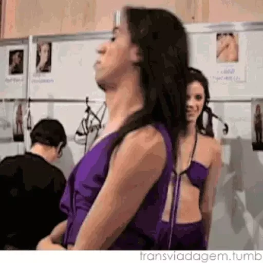 Mulher com cabelo preto e blusa roxa, com as mãos levantadas acima da cabeça.