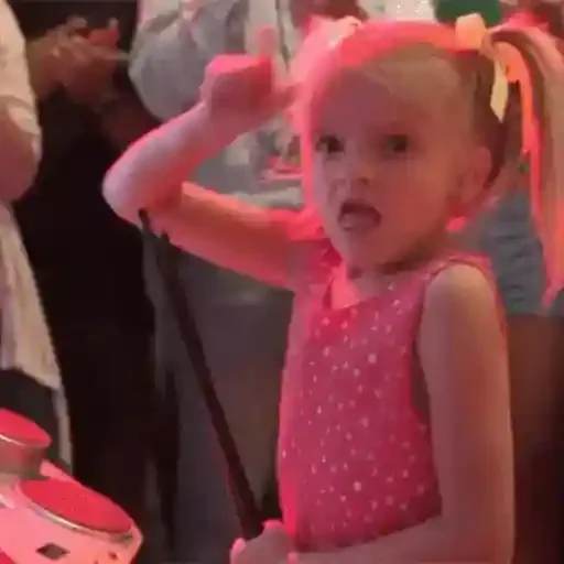 Niña pequeña con cabello rosa y vestido rosa, poniendo cara y levantando la mano, en un ambiente nocturno con iluminación rosa.